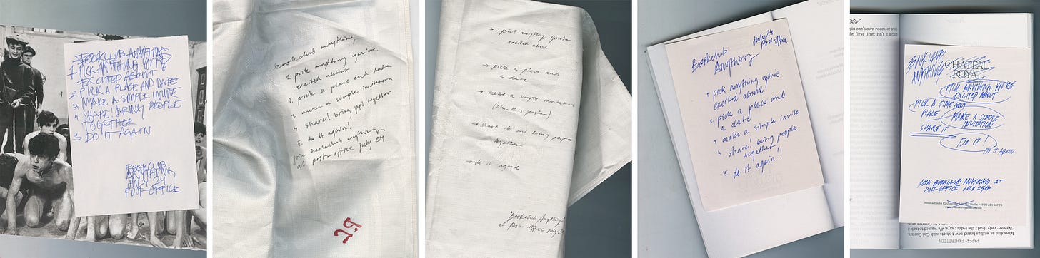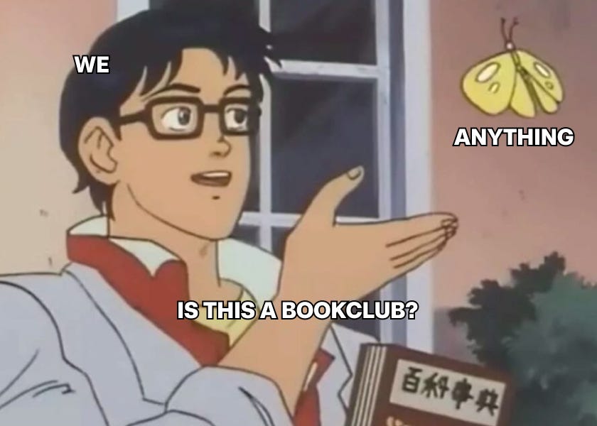 Imagine! You just saw something, felt something, questioned something. You’re itching to talk about it. Rather than firing up chat, socials or a podcast, you could actually gather people! You could bookclub it. You have the main essential: a topic. Done. Go. Bookclubs don’t require expertise, they don’t require production, they don’t even have to be original. The idea of bookclubbing itself isn’t either. We got it from Jared Zhang: “You can actually book club anything. You could have a book club but only for objects, you know. A book club that is not a book club at all, but it's fulfilling our needs of ingesting something and talking about it.”